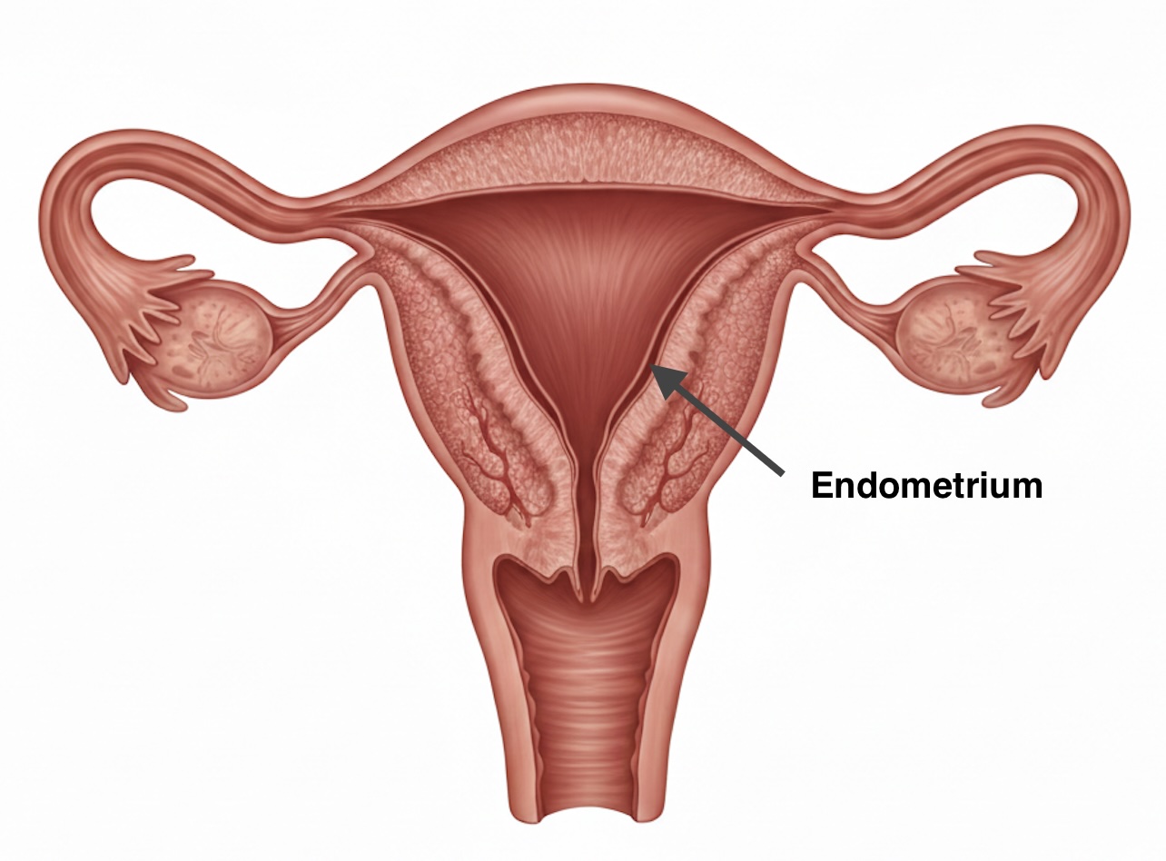 Normally the endometrium should only be present in the uterus but in women with endometriosis a similar but abnormal lining is also found in other places such as the ovaries, fallopian tubes, and other areas of the pelvis near the bladder or rectum. Rarely it can also be found in more unusual places such as in the abdomen, intestines or theoretically any place in the body.